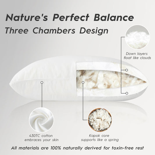 Globon Organic Down Pillows, Premium Down and Kapok Fiber Filling, 100% Cotton 430TC Shell, Medium Firm