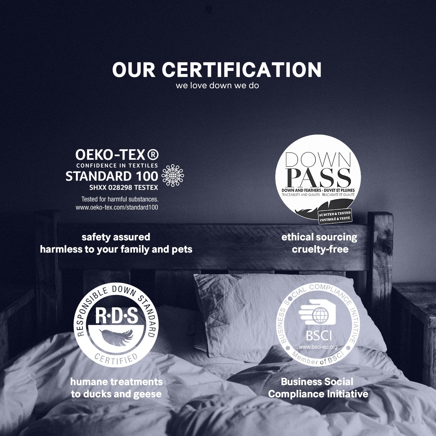 Dependent Certification: RDS Certified, OEKO-TEX STANDARD 100 certified, DOWNPASS audited, we guarantee non-living- plucking, non-cage-rearing and force-feeding, all the down and feathers are sourced from the food industry.