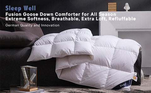 Filling: Filled with 650 fill power Suprelle® Fusion, 51/49 blend of high quality white goose down with the most down-like material named Cocoon Fiber, which is a high-tech innovation of ADVANSA in Germany, possesses less odour and offers better moisture transport and absorption, high bulk, re-fluffable and breathable, similar or even better than all down.