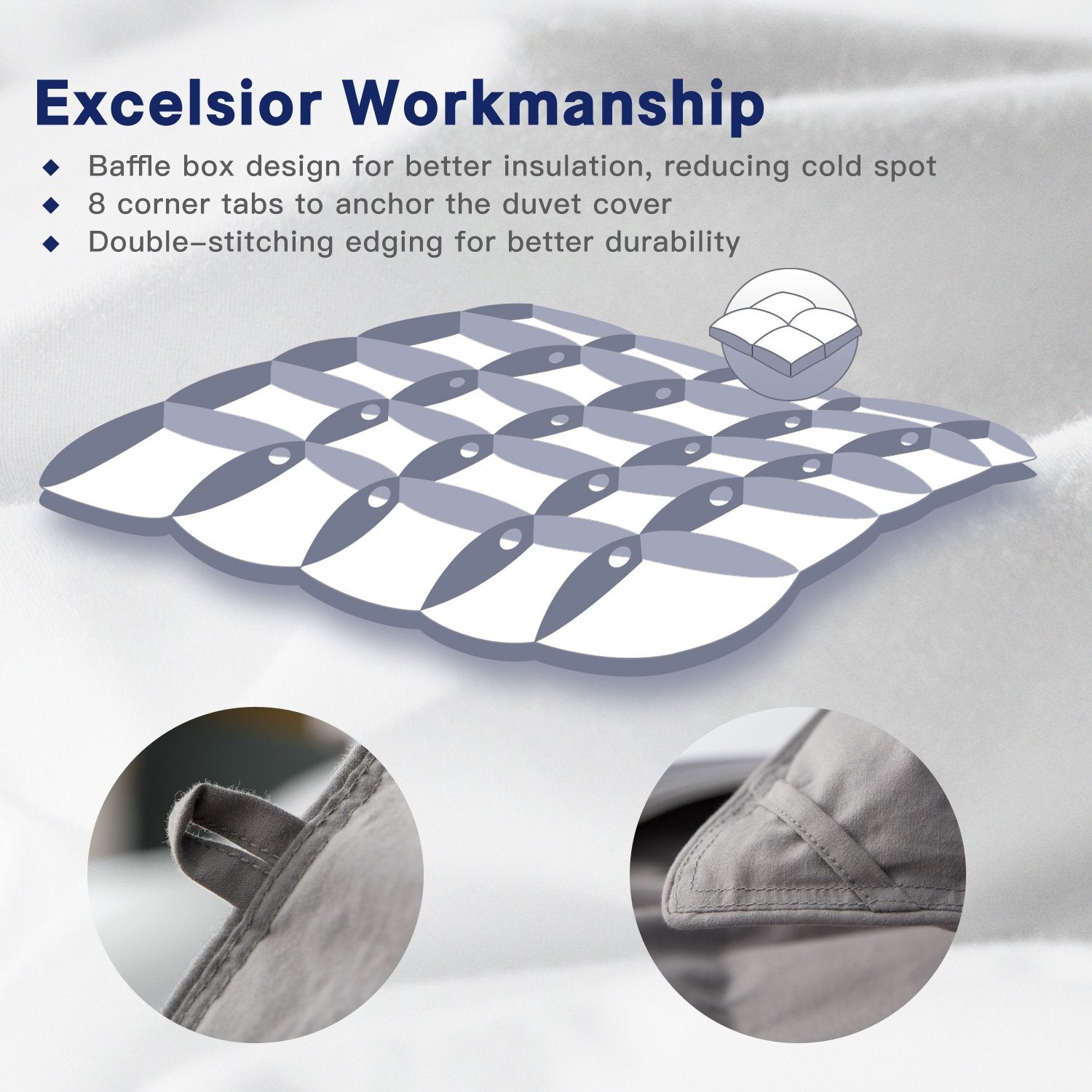 - BAFFLE BOX DESIGN: Keeps the filling at the maximum loft for maximum warmth. Ensure the filling stays in place. Elegant piping and 4 corner tabs to easily attach duvet covers.