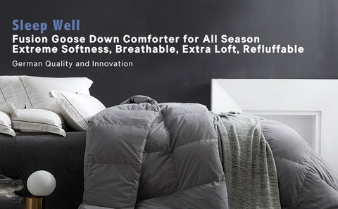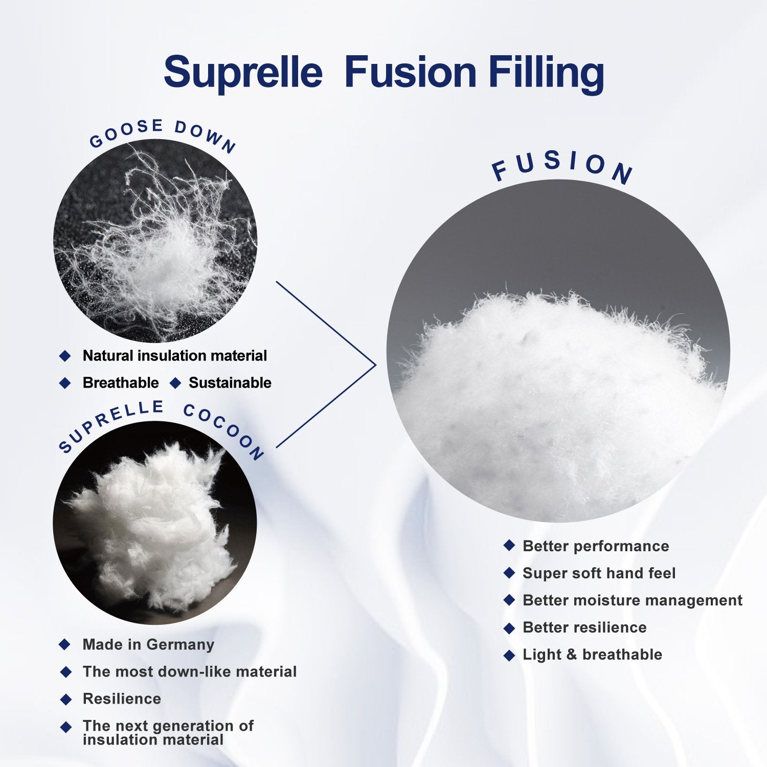 - SUPRELLE FUSION FILLING: Mixture material, 51/49 blend of high quality white goose down with the most down-like material named cocoon which is a high-tech innovation of ADVANSA in Germany, possesses less odour and offers better moisture transport and absorption, high bulk, re-fluffable and breathable, similar or even better than all down.